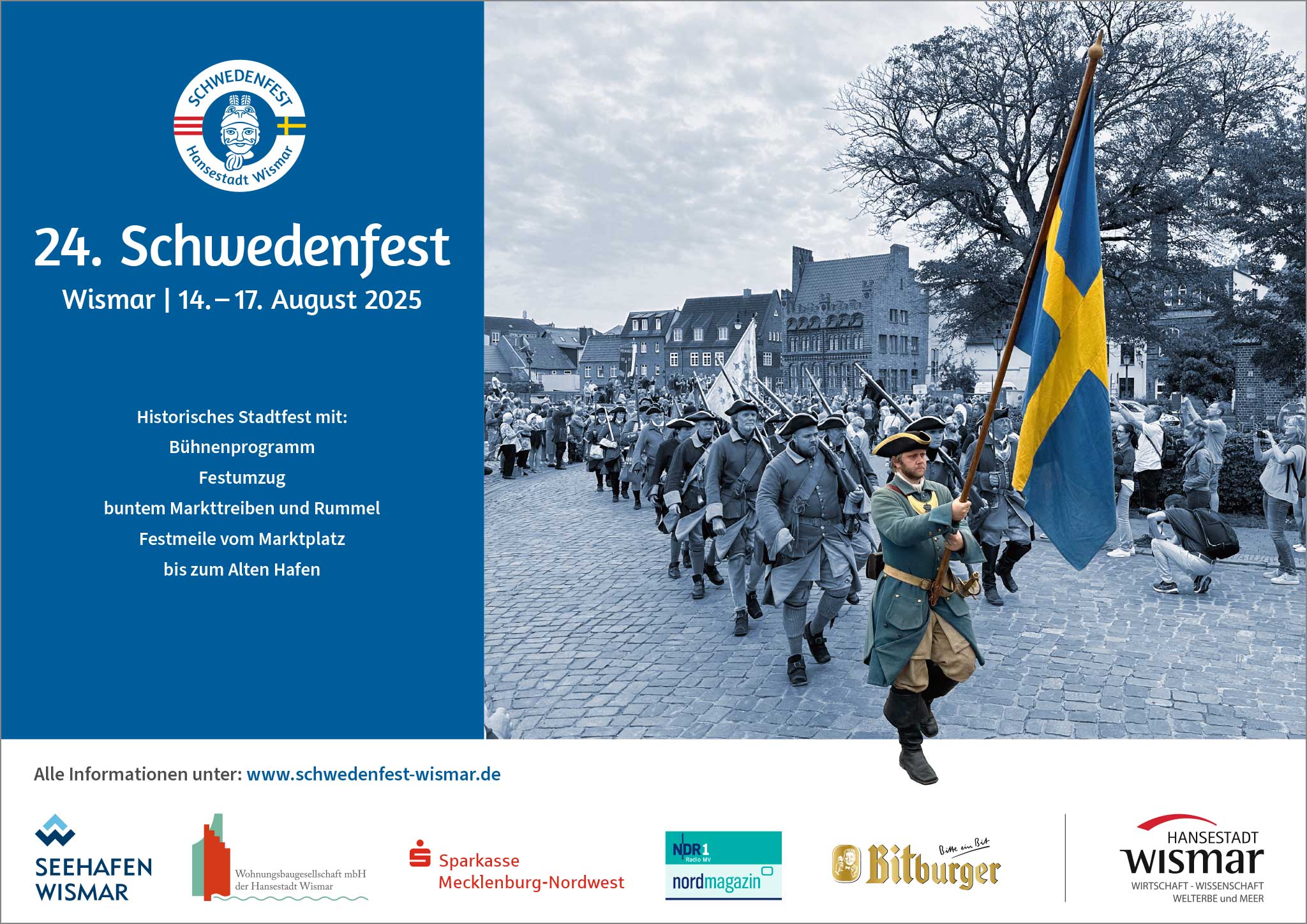Die Hansestadt Wismar schätzt, dass von Donnerstag bis Sonntag (14. bis 17. August 2025) rund 100.000 Besucherinnen und Besucher aus aller Welt das Schwedenfest in der Hansestadt Wismar gefeiert haben. Damit waren es ungefähr so viele Menschen wie zum Schwedenfest 2024. Für den Schwedenlauf waren 1.240 Läuferinnen und Läufer gemeldet, das ist ein neuer Rekord. Beim traditionellen Schwedenweg waren 29 Gruppen mit rund 500 Teilnehmerinnen und Teilnehmern dabei. Die Gruppen kamen aus der Region. Aber auch Gruppen aus anderen Bundesländern und aus unserer schwedische Partnerstadt Kalmar waren vertreten. Das 24. Schwedenfest in der Hansestadt Wismar endete am Sonntag mit der ABBA-Tribute-Show „ABBeR“ auf der Bühne auf dem Marktplatz.