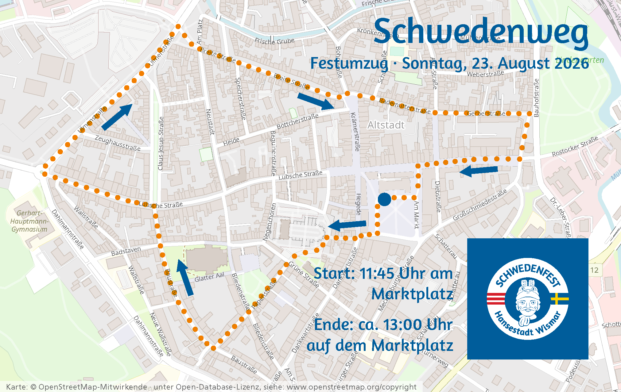 Der Schwedenweg ist eine Zeitreise durch die schwedische Geschichte der Hansestadt Wismar. Auf diesen Höhepunkt dürfen sich Wismarer und Gäste wieder am Sonntag, dem 23. August 2026, freuen. Los geht es um 11:45 Uhr vor dem Rathaus.